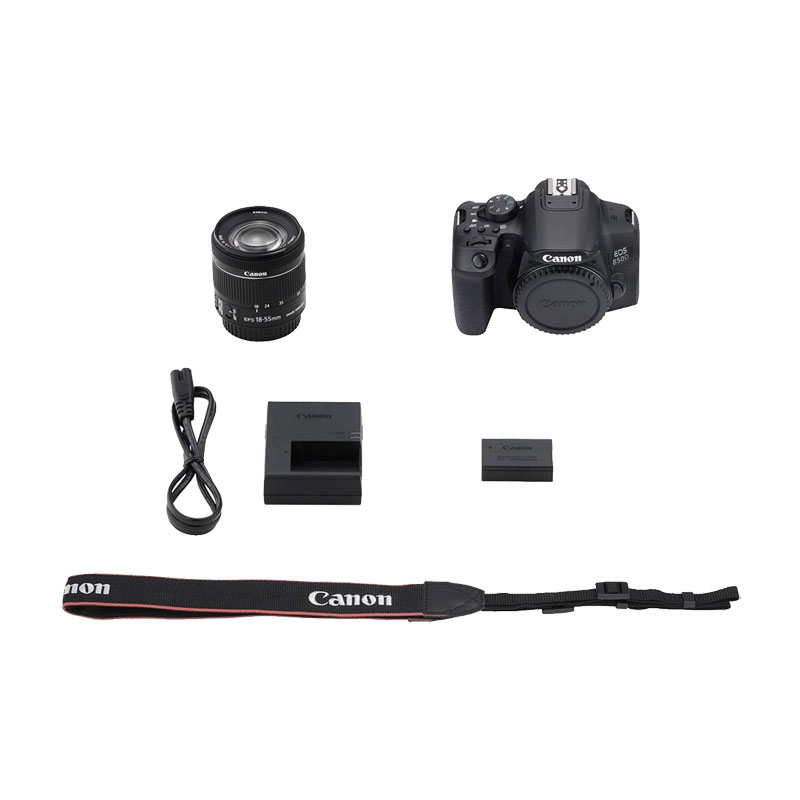 در بستهبندی علاوه بر بدنه اصلی دوربین Canon 850D، شاهد یک لنز Canon 18-55mm IS STM lens، یک باتری لیتیوم یون Canon LP-E17، شارژر Canon LC-E17، درپوش جلویی Canon RF-3 برای دوربینهای Canon EOS، چشمی Eyecup EF-2 و بند گردن دوربین EW-400D-N قابل مشاهده است.